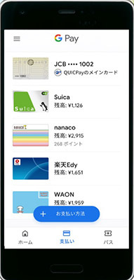 また、Google PayはクレジットカードのほかにもSuicaといった電子マネーも登録可能。つまり改札を通る時もリアルカードのSuicaを用意する必要がなく、スマートフォン(スマホ)を改札機にタッチするだけで電車に乗ることができる。極端な話、登録しているクレジットカードや電子マネー次第では、スマホだけで支払いをほぼ実現するのだ。