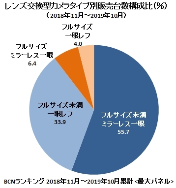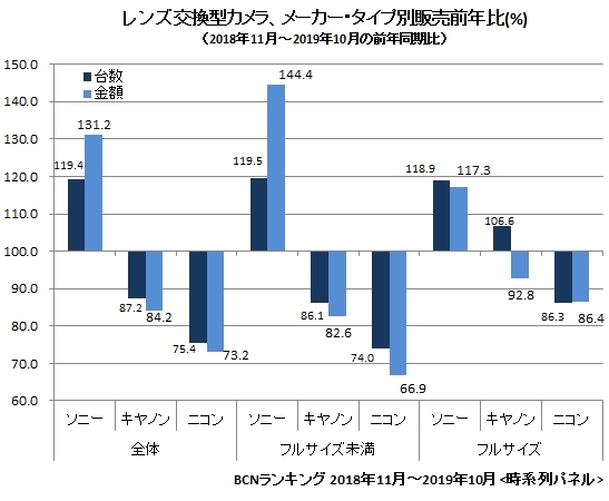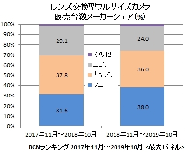 2018年11月から2019年10月までの1年間で、レンズ交換型全体の販売台数・金額の前年同期比を比較したところ、一眼レフとミラーレスを合わせたフルサイズカメラ全体で、ソニーは台数前年比118.9%、金額117.3%と2桁成長を維持している。追いかけるキヤノンは台数こそ106.6%と前年を上回ったが、金額では92.8%と前年割れ、ニコンに至っては台数・金額とも2桁割れに終わっている。ソニーに挑んだ2社ともに、急速に縮小するフルサイズ一眼レフをフルサイズミラーレスの投入でカバーできなかった。この結果、フルサイズカメラのメーカーシェアも、一眼レフが強いキヤノンから、ほぼミラーレスだけで戦うソニーが1位の座を奪い取った。