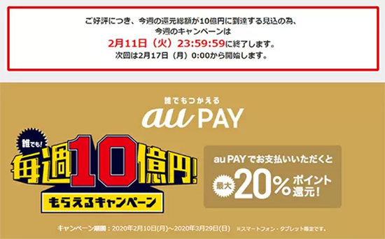 一方で、au PAYの今回の「誰でも!毎週10億円!もらえるキャンペーン」は高還元率・全店舗対象とユーザーからすれば最高にお得なキャンペーンなのだが、100億円祭並みの効果が得られるかというと少し疑問だ。新規ユーザー獲得が最大の狙いと思われるが、還元総額が10億円に達したら終了で次の週を待たなくてはいけない仕様は新規ユーザーに不親切だ。