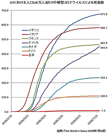 話を単純にするため、G7での死者数を比較する。新型コロナウイルスによる人口100万人当たりの累計死者数推移を確認した。データは、英オックスフォード大学が運営する「Our World in Data」のものを使った。7月29日時点で、最も多いのがイギリスで675.8人。グラフの曲線を見ると、まだまだ予断を許さない状況が続いている。勢いを止められていないのがアメリカ。450.9人と、このところ沈静化してきた462.8人のフランスを追い越すのも時間の問題だ。