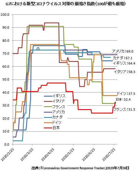 G7での推移をみると、死者が出始めた2月中旬ごろから、日本はイタリアに次ぐ厳しい規制をとっていたことが分かる。小・中・高校の臨時休校を始めたころだ。しかし、欧州を中心に感染が広がり、各国の規制はどんどん厳しさを増し、日本を上回るようになった。緊急事態宣言を発出しながらも自粛の要請にとどまっていた日本は、規制の厳格さという意味では、G7で最も低い値で推移している。